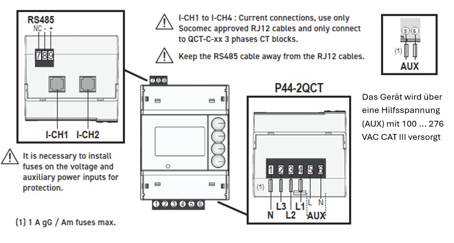 Dreiphasige Stromwandler mit Schnellanschluss RJ12 separat bestellen: QCT-C-25 194SO425 bis 160A, QCT-C-35 194SO435 bis 250A, QCT-C-45 194SO445 bis 630A, QCT-C-55 194SO455 bis 1000A