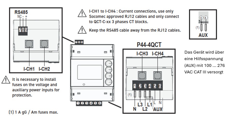 Dreiphasige Stromwandler mit Schnellanschluss RJ12 separat bestellen: QCT-C-25 194SO425 bis 160A, QCT-C-35 194SO435 bis 250A, QCT-C-45 194SO445 bis 630A, QCT-C-55 194SO455 bis 1000A