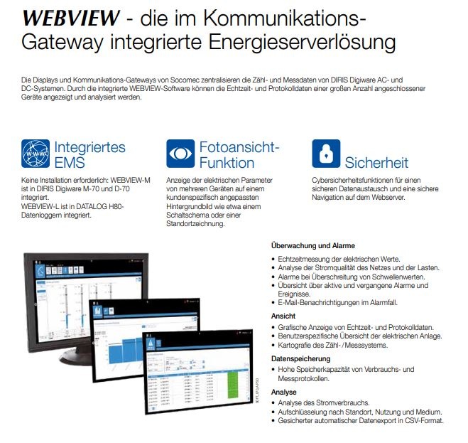 Mit dem Display DIRIS D-70 lassen sich die Daten auf dem WEBVIEW-M visualisieren, einem integrierten Webserver zur Leistungs- und Energieüberwachung.